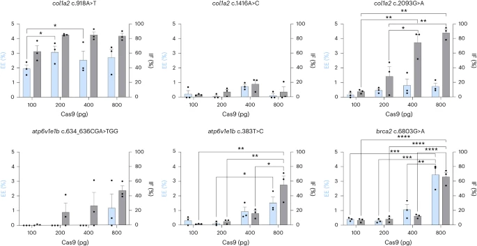 Fig. 1 Comparison of EE and IF obtained for each target by microinjection of Alt-R HDR components with 100, 200, 400 or 800 pg Cas9 into the yolk of one-cell-stage zebrafish embryos. Left-hand y axes show EE (blue) and right-hand y axes show IF (gray). The bars and error bars represent the mean + s.e.m. of three biologically independent replicates (n = 3), where each replicate represents a pool of 20–30 injected embryos. Tukey’s multiple-comparisons test: *P < 0.05, **P < 0.01, ***P < 0.001, ****P < 0.0001.