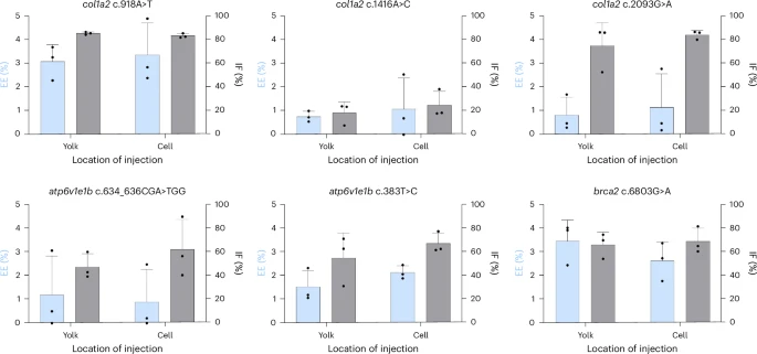 Fig. 2 Comparison of EE and IF obtained for each target by microinjection of Alt-R HDR components into the cell or the yolk.Zebrafish embryos at the one-cell stage were injected with 200 pg (col1a2 c.918A>T), 400 pg (col1a2 c.1416A>C, col1a2 c.2093G>A) or 800 pg (atp6v1e1b c.634_636CGA>TGG, atp6v1e1b c.383T>C, brca2 c.6803G>A) Cas9 into the cell or the yolk. Left-hand y axes show EE (blue) and right-hand y axes show IF (gray). Bars and error bars represent the mean + s.e.m. of three biologically independent replicates (n = 3), where each replicate represents a pool of 20–30 injected embryos. Unpaired t-test.