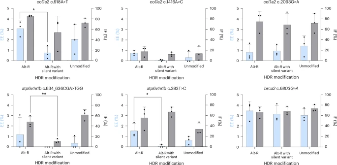 Fig. 3 Comparison of EE and IF obtained for each target by microinjection of Alt-R HDR templates, Alt-R HDR templates with silent guide-blocking variants or unmodified HDR templates.Zebrafish embryos at the one-cell stage were injected with 200 pg (col1a2 c.918A>T), 400 pg (col1a2 c.1416A>C, col1a2 c.2093G>A) or 800 pg (atp6v1e1b c.634_636CGA>TGG, atp6v1e1b c.383T>C, brca2 c.6803G>A) Cas9 into the yolk. Left-hand y axes show EE (blue) and right-hand y axes show IF (gray). The bars and error bars represent the mean + s.e.m. of three biologically independent replicates (n = 3), where each replicate represents a pool of 20–30 injected embryos. Dunnett’s multiple-comparisons test: *P < 0.05, **P < 0.01.