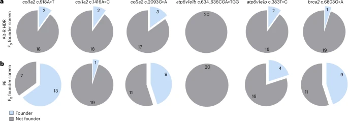 Fig. 5 F0 founder screen of 20 potential adult founder zebrafish generated by microinjection of HDR or PE components into the yolk of one-cell-stage zebrafish embryos. a, Results for zebrafish injected with Alt-R HDR components with 200 pg (col1a2 c.918A>T), 400 pg (col1a2 c.1416A>C, col1a2 c.2093G>A) or 800 pg (atp6v1e1b c.634_636CGA>TGG, atp6v1e1b c.383T>C, brca2 c.6803G>A) Cas9. b, Results for zebrafish injected with PE components (RNP mixture containing 480 ng/µL pegRNA and 1,380 ng/µL PE2-His protein).