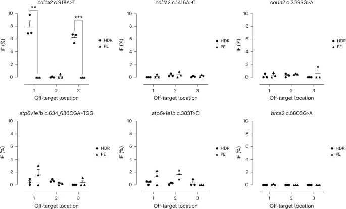 Fig. 6 IF at top three predicted off-target locations. IF was determined for Alt-R HDR components with 200 pg (col1a2 c.918A>T), 400 pg (col1a2 c.1416A>C, col1a2 c.2093G>A) or 800 pg (atp6v1e1b c.634_636CGA>TGG, atp6v1e1b c.383T>C, brca2 c.6803G>A) Cas9 or PE components (RNP mixture containing 480 ng/µL pegRNA and 1,380 ng/µL PE2-His protein) injected into the yolk of one-cell-stage zebrafish embryos. The bars and error bars represent the mean + s.e.m. of three biologically independent replicates (n = 3), where each replicate represents a pool of 20–30 injected embryos. Unpaired two-tailed t-test: **P < 0.01, ***P < 0.001.
