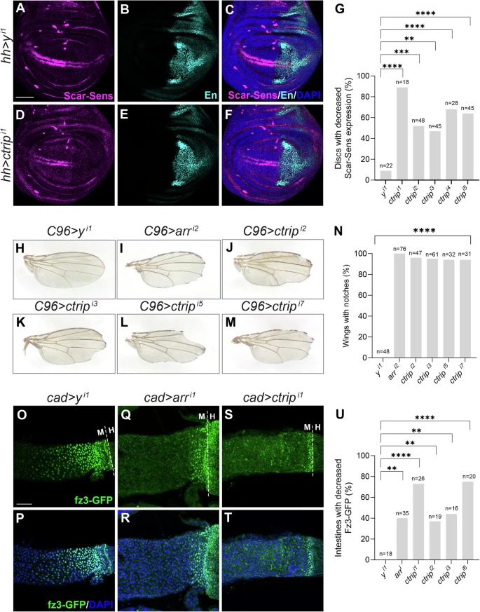 Fig. 2 Ctrip promotes Wingless signaling in Drosophila.RNAi constructs targeting yellow negative control or ctrip in the posterior compartment (marked by Engrailed (En, cyan)) of third instar larval wing discs using hedgehog (hh)-Gal4. Scarlet-Senseless (Scar-Sens, magenta) is a Wingless target gene reporter. DAPI (blue) marks nuclei. Scale bar (A–F): 50 μm. Dorsal, top; posterior, right. A–C hh-Gal4-driven expression of a yellow (y) RNAi control. Minimal loss of Scar-Sens was observed in the posterior compartment. D–F hh-Gal4-driven expression of RNAi construct targeting ctrip decreases Scar-Sens in the posterior compartment. G Quantification is the percentage of wing discs with decreased Scar-Sens. N is the number of wing discs analyzed. RNAi constructs targeting yellow, arrow (positive control), or ctrip expressed using the C96-Gal4 driver. H C96-Gal4-driven expression of RNAi construct targeting yellow (y). No wing notches were observed. I–M C96-Gal4-driven expression of RNAi constructs targeting arrow (arr) or ctrip resulted in notches at wing periphery. N Quantification for H–M is shown as percentage of wings with notches. N is the number of wings analyzed. RNAi constructs targeting yellow, arrow (arr), or ctrip expressed in posterior midgut using the cad-Gal4 driver. frizzled3-GFP (green) is a Wingless target gene reporter. The dashed line indicates the midgut-hindgut boundary (MHB). O, P cad-Gal4-driven expression of y. No fz3-GFP reduction was observed. Q, R cad-Gal4-driven expression of RNAi targeting arr results in loss of fz3-GFP near midgut-hindgut boundary. S, T cad-Gal4-driven expression of RNAi targeting ctrip results in partial or complete loss of fz3-GFP expression in posterior midgut. DAPI (blue) marks nuclei. Scale bar (O–T): 50 μm. U Quantification shown as percentage of intestines with decreased fz3-GFP. N is the number of adult intestines analyzed. Statistical significance (G, N, U) was analyzed by Fisher’s exact test (two-sided). p-values for G are <0.0001, 0.0005, 0.0024, <0.0001, <0.0001 respectively. p-values for N are all <0.0001. p-values for U are 0.0020, <0.0001, 0.0080, 0.0021, <0.0001, respectively. **p < 0.01, ***p < 0.001, ****p < 0.0001. Source data are provided in the Source Data file.