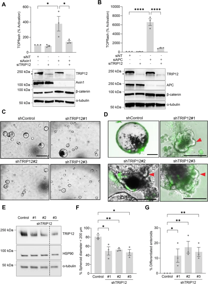 Fig. 3 TRIP12 functions downstream of β-catenin stabilization.A HEK293STF cells were transfected as indicated with nontargeting (siNT) control, TRIP12 siRNAs, Axin siRNAs, or TRIP12 and Axin siRNAs. TOPflash reporter activity quantified, and cell extracts immunoblotted for TRIP12, Axin, and β-catenin. *indicates a nonspecific band. Graphs show mean ± SEM of TOPflash normalized to cell number and control. Significance assessed using the one-way ANOVA with Tukey’s test. p-value for siAxin1 versus siNT is 0.0167 and for siAxin1 versus siAxin1 + siTRIP12 is 0.0366. For A and B, TOPflash and immunoblots are representative of at least three independent experiments. n = 3 wells of cells per treatment group per experiment. α-tubulin is loading control. B HEK293STF cells transfected as indicated with siNT control, TRIP12 siRNAs, APC siRNAs, or TRIP12 and APC siRNAs. TOPflash reporter activity quantified, and cell extracts immunoblotted for TRIP12, APC, and β-catenin. *indicates a nonspecific band. Significance assessed using one-way ANOVA with Tukey’s test. p-values for siAPC versus siNT and siAPC versus siAPC + siTRIP12 are <0.0001. APCmin organoids infected with control shRNA (Control) or three distinct shTrip12 lentiviral particles (#1, #2, and #3), imaged, and quantified for C, F organoid diameter (<200 μm) after 3 days, and evidence of D, G differentiation (villus formation, indicated by arrowheads) after 4 days. F: n > 50 organoids per experiment, G: n > 20 organoids per experiment. Scale bar in C 800 μm, D 50 μm. D GFP marks lentivirus-infected cells. Graphs show mean ± SEM of three independent replicates. Significance for F was analyzed by two-tailed Student’s t test and p-values are 0.0338, 0.0030, 0.0103, respectively. Significance for G was analyzed by one-tailed Student’s t test and p-values are 0.0286, 0.0058, 0.0046, respectively. E Immunoblotting was performed to confirm reduction in TRIP12 levels. HSP90 and α-tubulin are loading controls. Representative images are shown (n = 3 independent experiments). The dashed line between #2 and #3 represents intervening wells. *p < 0.05, **p < 0.01, ****p < 0.0001. Source data are provided in the Source Data file.