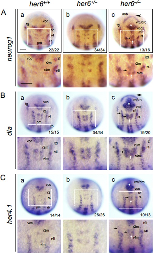 Fig. 4 Ectopic expression of proneural cluster-related genes in her6 mutants. Offspring of heterozygotic crosses were stained by WISH at the bud stage (neurog1, dla, her4.1), photographed, and then genotypes. Dorsal views are shown with anterior to the top. The expression patterns in whole embryos (top) and hindbrain regions boxed above (bottom) are shown for respective genes and genotypes. Arrowheads indicate enhanced expression in the anterior-most portion of the neural plate (anb). Arrows (black and white) mark ectopic expression in r3 (m-IPCD-r3, l-IPCD-r3) and midline (md-IPCD-r3/5), respectively. Asterisks (*) indicate ectopic expression around drc and vrc and enhanced expression in vcc. Numbers of the embryos with the indicated expression patterns and total scored embryos are shown in the bottom-right. See the legend to Fig. 1 for abbreviations. Scale bars, 100 μm.