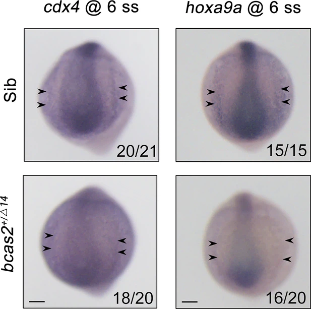 Fig. 3 - Supplemental 2 Expression patterns of cdx4 and hoxa9a in bcas2+/Δ14 embryos and their siblings at the 6-somite stage. Black arrows indicate the posterior lateral mesoderm. Scale bars, 100 μm