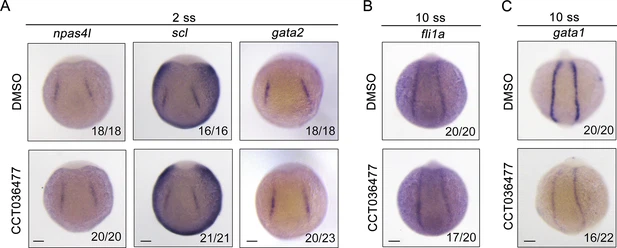 Fig. 3 - Supplemental 3 Inhibition of Wnt signaling does not affect the generation of hemangioblasts or their endothelial differentiation, but impairs their hematopoietic differentiation. Expression of hemangioblast markers npas4l, scl, gata2 (A), endothelial marker fli1a (B) and erythroid progenitor marker gata1 (C) at the indicated stages. Wild-type embryos were treated with 10 µM CCT036477 from 9 hpf and then collected for whole-mount in situ hybridizations. DMSO treated wild-type embryos were regarded as control groups. Scale bars, 100 μm (A–C).