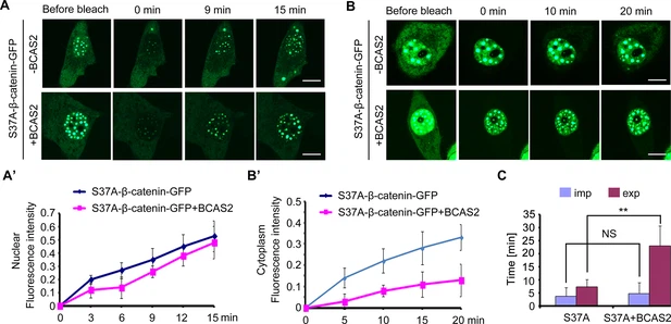 Fig. 5 - Supplemental 1 BCAS2 inhibits the nuclear export of β-catenin. (A–B’) GFP-tagged S37A-β-catenin was co-expressed with or without BCAS2 in HeLa cells. The entire nucleus (A) or entire cytoplasm (B) was bleached. (A, A’) Representative images at the indicated timepoints (A) and the related fluorescence recovery curves (A’, n=7) showing the kinetics of nuclear import of S37A-β-catenin. (B, B’) Time-lapse imaging (B) and recovery curves (B’, n=7) from cytoplasmic photobleaching experiments reflecting the kinetics of nuclear export of S37A-β-catenin. (C) Quantitative analysis of fluorescence recoveries after photobleaching (n=7). ns, not significant, **p<0.01 (Student’s t-test). Scale bars, 10 μm (A, B).