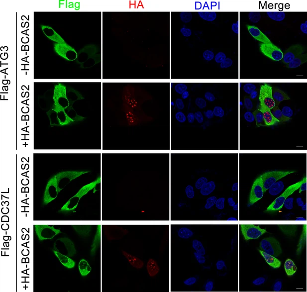 Fig. 5 - Supplemental 2 Overexpression of BCAS2 slightly enhances the nuclear accumulation of CDC37L and has no influence on the distribution of ATG3. HeLa cells were transfected with the indicated plasmids and then subjected to immunostaining using anti-Flag and anti-HA antibodies. The nuclei were labeled with DAPI. Scale bar, 10 μm.