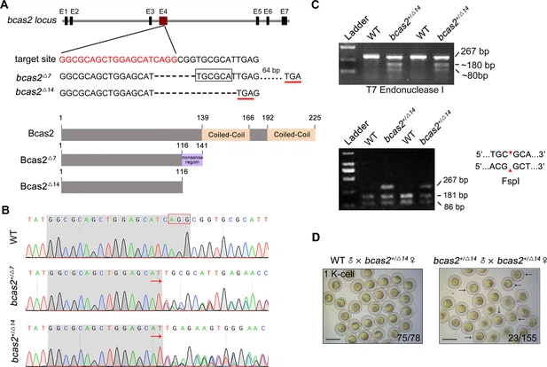 Fig. 1 - Supplemental 2 Zebrafish bcas2 mutants are generated by using CRISPR/Cas9 system. (A) Schematic showing generation of bcas2 mutants. Two mutant lines were obtained with mutations that resulted in premature translation termination, resulting in truncated Bcas2 proteins lacking the C-terminal CC domains. (B) Identification of bcas2 mutations using DNA sequencing. (C) The bcas2+/Δ7 and bcas2+/Δ14 mutants were identified via T7 endonuclease (the upper panel) or FspI restriction enzyme (the lower panel) digestions. (D) Bright-field images of embryos derived from crossing indicated females with heterozygous male mutants. Black arrows refer to the embryos that exhibited an abnormal cleavage. The ratio of viable embryos was indicated. Scale bars, 1 mm (D).