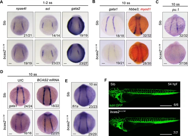 Fig. 2 bcas2 is required for hematopoietic progenitor differentiation. (A–C) Expression analysis of hemangioblast markers npas4l, scl, gata2 (A), erythroid progenitor markers gata1, hbbe3 (B), and myeloid marker pu.1 (C) in bcas2+/Δ14 embryos and their wild-type siblings at indicated stages. (D) Expression changes of gata1 in bcas2+/Δ14 embryos overexpressing BCAS2 at the 10-somite stage. The indicated embryos were injected with or without 300 pg of human BCAS2 mRNA at the one-cell stage. (E) Expression of endothelial marker fli1a in bcas2+/Δ14 and sibling embryos at the 10-somite stage. (F) Confocal imaging of bcas2+/Δ14 and control sibling Tg(kdrl:GFP) embryos at 54 hpf. Scale bars, 100 μm (A–E), 500 μm (F).