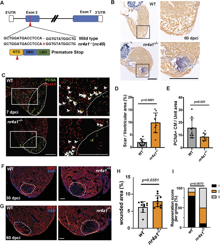 Impaired cardiac regeneration in nr4a1 mutants. (A) Diagram depicting the generation of nr4a1 mutants, illustrating the mutations at both the genome and protein levels. (B) AFOG staining performed on wild-type (WT) and nr4a1 mutant samples at 60 dpci. Boxed regions show the position of magnified images on the right. (C) PCNA/Nkx2.5 double immunostaining to detect proliferating cardiomyocytes at 7 dpci on WT and nr4a1 mutant cardiac sections. Arrowheads indicate the proliferating cardiomyocytes. Boxed regions show the approximate positions for quantification. (D) Quantification of scar area based on AFOG staining. (E) Quantification of colocalization between PCNA and Nkx2.5 per unit area for both WT and nr4a1 mutant samples. (F,H) Section images of WT or nr4a1 mutant ventricles at 30 dpci assessed for muscle recovery (F) and quantification of injured area (H). (G,I) Myocardial regeneration was measured at 60 dpci in WT and nr4a1 mutants, respectively. Ten individual samples in each group were examined. Myocardial regeneration is categorized as follows: 1, complete regeneration of a new myocardial wall; 2, partial regeneration; and 3, a strong block in regeneration. Dashed lines (C,F,G) show the wounded area. P-values<0.05 were considered statistically significant (two-tailed unpaired t-test, D,E,H; Chi-squared test, I). Points in D, E and H show the individual samples. Data are mean±s.e.m. Scale bars: 275 µm (B); 250 µm (C); 100 µm (F,G).