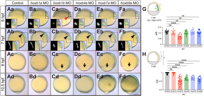Hoxb morphant embryos exhibit defective mesendodermal cell ingression/migration and epiboly movement delay. (Aa-Fd) Overlay of brightfield and fluorescence images of control antisense morpholino oligonucleotide (MO) (Aa-Ad), hoxb1a MO (Ba-Bd), hoxb1b MO (Ca-Cd), hoxb4a MO (Da-Dd), hoxb7a MO (Ea-Ed) and hoxb9a MO (Fa-Fd) injected Tg(-1.8gsc:GFP) embryos at 6 hpf (shield stage in control embryos), 7 hpf (60% epiboly stage in control embryos), 9 hpf (90% epiboly stage in control embryos) and 10.5 hpf (bud stage in control embryos). Insets show separate brightfield and fluorescence images. Red arrowhead points at defective cell mesendoderm ingression at the dorsal blastoderm margin at 6 hpf. Black arrowheads point to the leading edge of mesendodermal cells migrating towards the animal pole. Arrows point to the blastoderm margin for the embryos exhibiting epiboly delay. All images are lateral view. Dorsal side is to the right. Scale bar: 200 µm. (G) Quantification of animal pole-oriented migration of mesendodermal cells [GFP-positive cells in Tg(-1.8gsc:GFP)] by the ratio of the length of the GFP-positive ingressed mesendoderm (a) to the distance from the blastoderm margin to the animal pole (b) in control MO (n=20, N=3), hoxb1a MO (n=14, N=3), hoxb1b MO (n=18, N=3), hoxb4a MO (n=20, N=3), hoxb7a MO (n=19, N=3) and hoxb9a MO (n=18, N=3) injected embryos at 7 hpf. ****P<0.0001 (one-way ANOVA). (H) Quantification of epiboly progression by the ratio of the blastoderm length (c) to the total embryo length from the animal pole to the vegetal pole (d) in control MO (n=26, N=3), hoxb1a MO (n=26, N=3), hoxb1b MO (n=25, N=3), hoxb4a MO (n=17, N=3), hoxb7a MO (n=24, N=3) and hoxb9a MO (n=17, N=3) injected embryos at 9 hpf. ****P<0.0001 (Kruskal–Wallis test). In G,H, data are shown as mean±s.e.m. ns, not significant (P>0.05).