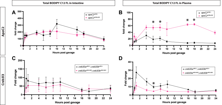 The loss of Creb3l3 may affect lipid secretion from the enterocyte. A: Fluorescent signal of BODIPY-C12 within intestinal homogenate over 24 h post gavage shows no significant difference between