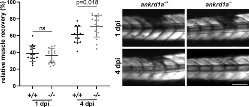 Fig. 11 Relative skeletal muscle recovery in ankrd1a mutant (ankrd1a−/−) and wild-type (wt) (ankrd1a+/+) larvae injured by glass capillary at 72 h postfertilization (hpf). Muscle integrity was analyzed in 15 wt and 19 ankrd1a mutant larvae. Images were taken 1 and 4 days after the injury. Birefringence intensity was measured in LAS X software. Results are expressed as a percentage of signal intensity (gray values/µm2) in injured somites when the signal intensity of adjacent noninjured somites on both sides of the injury was set to 100%. Scale bar, 500 µm. ns, nonsignificant.