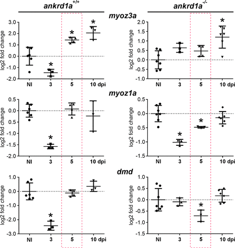 Fig. 12 The expression of maturation markers myoz3a, myoz1a, and dmd is affected in ankrd1a mutant zebrafish during injury repair. qPCR was performed using RNA isolated from noninjured (NI) and injured muscle of both genotypes [wild-type (wt) and ankrd1a mutant] at 3, 5, and 10 days postinjury (dpi) (minimum 3 zebrafish for each timepoint). Red dashed rectangles emphasize results obtained at 5 dpi for easier comparison. Results are presented as log2 fold change ± SD. Statistical analysis was performed using the one-way ANOVA with Dunnett’s post hoc test. The exact P values are given in Supplemental Table S8. Average Ct values ± SD are listed in Supplemental Table S4. *P ≤ 0.05.