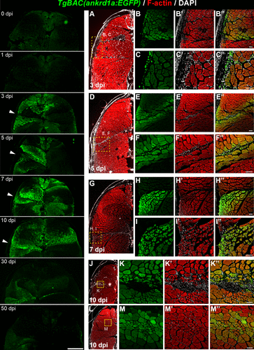 Fig. 3 TgBAC(ankrd1a:EGFP) expression in injured skeletal muscle. Left: representative images of dorsal halves of zebrafish sections at designated timepoints after the injury (n = 3 for each time point). White arrowheads point to the needle entry site. Right: representative higher magnification images of cryosections obtained from injured zebrafish at 3 (B–B″, C–C″), 5 (E–E″, F–F″), 7 (H–H″, I–I″), and 10 (K–K″, M–M″) days postinjury (dpi) (n = 3 for each timepoint). Insets in lower magnification images (A, D, G, J, and L) delineate the area of higher magnification images on the right. Scale bars, 250 μm for the left panels and 50 μm for B–C″, E–F″, H–I″, K–K″, and M–M″. EGFP, enhanced green fluorescent protein.