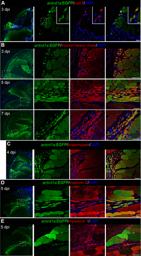 Fig. 6 Newly forming myofibers express TgBAC(ankrd1a:EGFP). Cryosections of injured skeletal muscle of the reporter line TgBAC(ankrd1a:EGFP) (n = 3), at indicated timepoints, were stained for muscle markers: embryonic myosin Myh7 (A), myosin (B), tropomyosin (C), troponin C (D), and myozenin 1 (E). Nuclei were stained with DAPI. Low-magnification images are on the left with marked positions (dashed boxes) of higher-magnification images on the right. Elongated myofibers inside the injury area on B and D correspond to longitudinally cut fibers. Scale bars, 20 μm for A, 5 μm for insets in A, and 50 μm for B–E, for higher magnification images on the right. EGFP, enhanced green fluorescent protein.