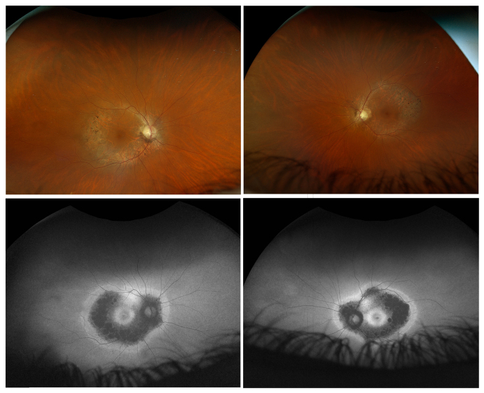 Fig. 4 Color fundus and autofluorescence images from affected participant III-1. The upper row shows color fundus images from age 63 years showing bone spicule retinal degeneration confined to the near periphery. The bottom row shows autofluorescence imaging showing a hypo-autofluorescence band confined to the posterior pole plus hyper-autofluorescence beyond this area and at each macula. This would be described as pericentral retinitis pigmentosa.