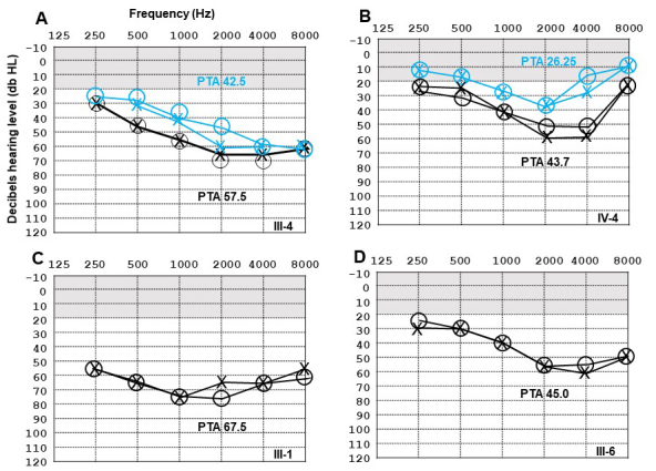 Fig. 5 Audiograms for affected members of the family. Normal hearing range is highlighted by gray boxes (≤19.9 db HL) and specific family members denoted in the bottom right corner of the plot. (A) Hearing test in proband III-4. The X symbol is data from the left ear and the circle symbol is data from the right ear. Blue traces at age 28 and black traces at age 60 show progression of hearing loss over time. PTA scores are denoted in a corresponding color. (B) Hearing test in son of proband (IV-4). Blue traces at age 16 and black traces at age 22 show progression of hearing loss over time. (C) Hearing test in brother of proband (III-1). Audiogram traces at age 57 show severe hearing loss (PTA highest of all members tested). (D) Hearing test in sister of proband (III-6). Audiogram traces at age 51 correspond to lower hearing loss (PTA 45.0) compared to her two siblings (A and C).