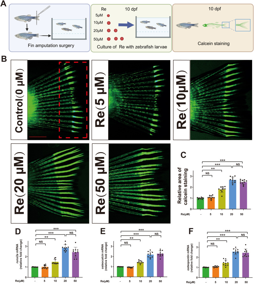 Fig. 2 Ginsenoside Re promotes bone formation ability during fin regeneration in the zebrafish fin amputation surgery model. A. Schematic representation of the assessment of the effect of Ginsenoside Re on tail fin regeneration in the zebrafish tail fin amputation model using calcein staining. B. Results of calcein staining in zebrafish tail amputation model treated with different concentrations of Ginsenoside Re for 10 days. C. Histogram results of calcein staining of zebrafish treatment with Ginsenoside Re at 0–50 μM. D-F. The relative expression of mRNAs for runx2a, osteocalcin and osteopontin in Zebrafish under treatment with various concentrations of Ginsenoside Re. Statistical methods: two-tailed Student's t-test, (∗P < 0.05, ∗∗P < 0.01, ∗∗∗P < 0.001).
