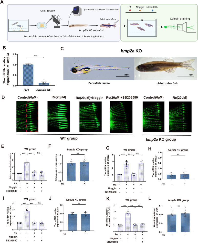 Fig. 6 Ginsenoside Re modulates bone formation via the Bmp2/p38 pathway in vivo. A. The in vivo experimental demonstration illustrates the construction of the bmp2a knockout zebrafish model. After tail amputation surgery, both the bmp2a KO group and the control group were co-cultured with Re, noggin, and SB203580 for 7 days. The effects of Re, bmp2a and the p38 pathway(mapk14a) on zebrafish bone formation were evaluated using calcein green staining. B-C. After constructing the bmp2a knockout zebrafish model, qPCR technology was utilized to verify the knockout results. Additionally, the appearance of zebrafish larvae and adult fish after bmp2a knockout was demonstrated. D-F. The bone formation in the tail fin of the zebrafish models from the control group and the bmp2a KO group was assessed using calcein staining after treatment with Re, noggin and SB203580. G-L. The relative expression levels of osteocalcin, bmp2a, mapk14a mRNA in the tail fin of the zebrafish models from the bmp2a knockout group and the control group after treatment with Re, noggin and SB203580. Statistical methods: two-tailed Student's t-test, (∗P < 0.05, ∗∗P < 0.01, ∗∗∗P < 0.001).