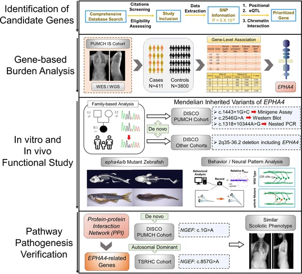 Fig. 1 - Supplemental 1 Flowchart for identification of causative genes. The processes of candidate gene mapping and gene-based burden analysis were described. The variants in EPHA4 and NGEF identified in each cohort were displayed. Abbreviations: SNP: single-nucleotide polymorphism; eQTL: expression quantitative trait locus; IS: idiopathic scoliosis
