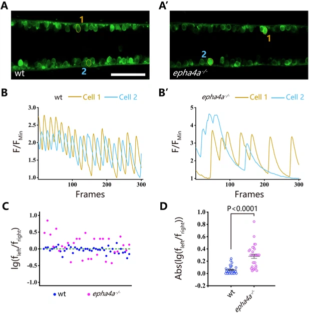 Fig. 4 Uncoordinated left-right activation of spinal cord neurons in epha4a mutants. (A, A’) Fluorescent images showing the dorsal view of 24 hr post-fertilization (hpf) Tg(elavl3:GAL4; UAS:GCaMP) double transgenic larvae. The corresponding movies are shown in Videos 5 and 6. (B, B’) Line charts showing the quantification of fluorescence changes of the region of interests (ROIs, circled in A, A’) in wild-type larvae and epha4a mutants. (C) Scatter plot showing the distribution trend of the ratio of the calcium signal frequency between left and right in wild-type (N=14 larvae, n=42 experiments) and epha4a mutants (N=10 larvae, n=30 experiments). (D) Statistical graph of the ratio of the calcium signal frequency between left and right in wild-type larvae and epha4a mutants. Scale bars: 50 μm in panels (A, A’).