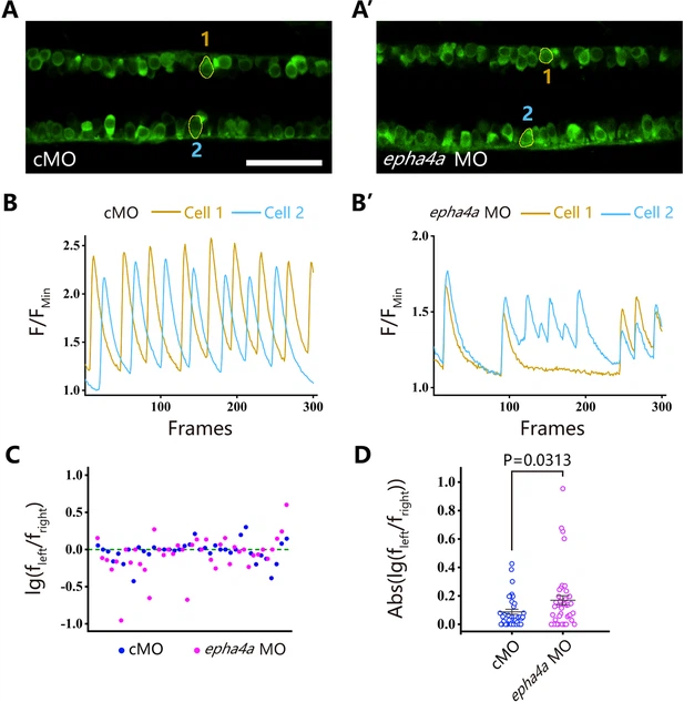 Fig. 4 - Supplemental 1 Uncoordinated left-right activation of spinal cord neurons in the absence of Epha4a. (A, A’) Fluorescent images showing the dorsal view of 24 hr post-fertilization (hpf) Tg(elavl3:GAL4; UAS:GCaMP) double transgenic larvae. The corresponding movies are shown in Videos 7 and 8. (B, B’) Line charts showing the quantification of fluorescence changes of the region of interests (ROIs, circled in A, A’) in control and epha4a morphants. (C) Scatter plot showing the distribution trend of the ratio of the calcium signal frequency between left and right in control (N=15 larvae, n=38 experiments) and epha4a morphants (N=15 larvae, n=41 experiments). (D) Statistical graph of the ratio of the calcium signal frequency between left and right in control and epha4a morphants. Scale bars: 50 μm in panels (A, A’).