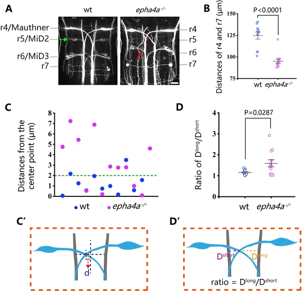 Fig. 5 Disorganized neural patterning in epha4a mutants. (A) Confocal images showing reticulospinal neuronal axons in 48 hr post-fertilization (hpf) wild-type and epha4a mutant larvae visualized with anti-neurofilament antibody RMO44. Asterisks indicate the cross sites of Mauthner axons. The green arrow indicates the cell body of the r5/MiD2 neuron in a wild-type larva. The red arrow points to the ipsilaterally projected axon of r6/MiD3 in the mutant larva, which is normally projected to the other side in wild-type fish. (B) Statistical chart showing the distance between r4 and r7 of 48 hpf wild-type and epha4a mutants. (C) Scatter plot showing the distance (d) between the center line and the intersection site of Mauthner axons as indicated in panel C′. (D) The ratio of the distance between the intersection site of Mauthner axons and bilateral axon bundles in 48 hpf wild-type (N=11 larvae) and epha4a mutants (N=12 larvae). The ratios were calculated as in panel D′. Scale bars: 20 µm in panel (A).