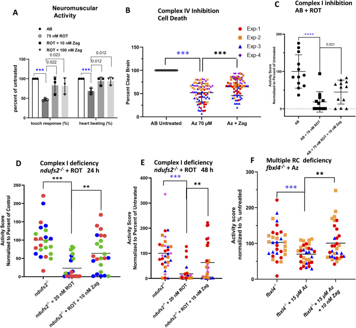 Zag rescues neuromuscular deficits in pharmacological models of complex I and complex IV deficiency. (A) Evaluation of complex I pharmacologic model (AB+ ROT) for touch response and presence of heartbeat demonstrates that zag at both 10 and 100 nM significantly rescued the toxicity of 75 nM ROT; graph indicates the mean and standard deviation of three biological replicates, with n = 10 for each replicate. P-value threshold was p < 0.025 after Bonferroni correction for two comparisons. (B) Complex IV inhibition by 70 µM azide (Az) resulted in brain cell death that, in turn, was rescued significantly by 10 nM zag n ∼ 15 for each of four biological replicates; mean ± std. dev shown. P-value threshold was p < 0.05. (C–E) Swim activity of larvae was rescued in three separate models of PMD. (C) ROT inhibition (70 nM) of complex I in WT larvae demonstrated a loss of ∼80%, which was rescued by an over 2-fold increase in the residual activity. P-value threshold was p < 0.05. (D,E) In ndufs2−/− larvae, additional stress introduced by the presence of 20 nM ROT for 24 or 48 h resulted in a swim activity reduction of ∼80% or 90%, respectively, which was rescued over 4-fold by 10 nM Zag; aggregate means of four biological replicates, with n∼10 each replicate represented by different colors and shapes for each time. (F) In multiple complex-deficient fbxl4−/− larvae, additional stress introduced by 15 µM azide resulted in a ∼40% reduction in swim activity that was fully rescued by the presence of 10 nM Zag in three separate biological replicates; the data points are differentiated by different color and shape. P-value threshold was p < 0.025 after Bonferroni correction of two comparisons for (D–F). In each experiment, the four separate replicates are differentiated by different data point colors and shapes. Zag-treated cohort, where the data points are colored based on replicate. Mean ± std. dev for the four aggregated replicates are shown. For all multiple testing using the Bonferroni correction, the QC comparison (i.e., untreated WT vs. poisoned) was excluded, as it served a different purpose. The significance level for this comparison was indicated separately by blue stars (A,C).