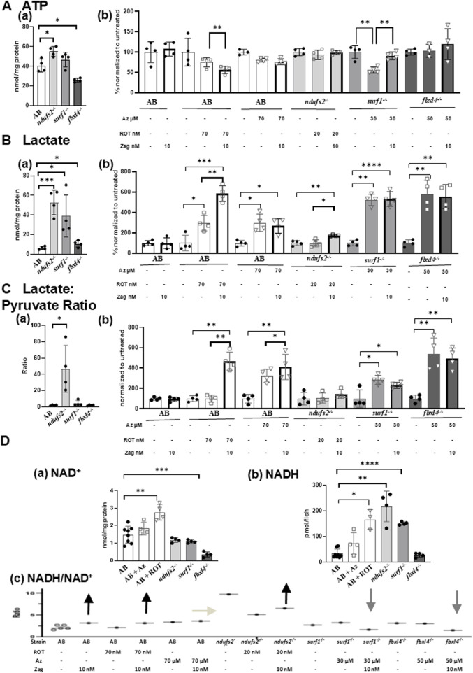Effects of zag treatment on ATP, lactate, lactate/pyruvate, and NADH/NAD levels in pharmacological and genetic models of complex I and complex IV deficiency.