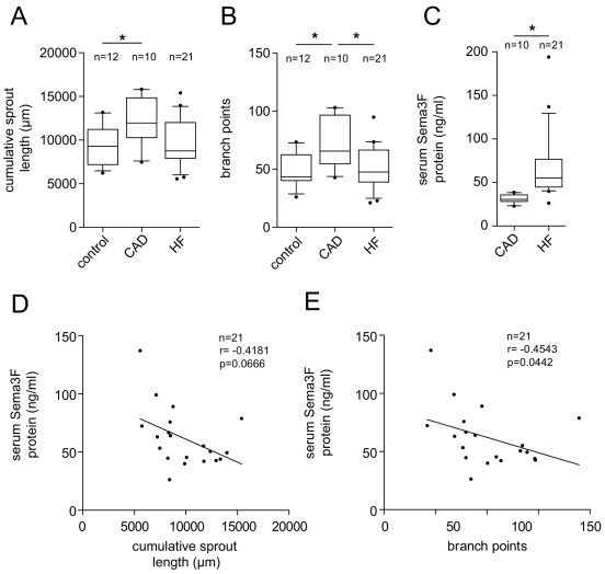 Fig. 3 Serum from HF patients inhibits sprouting and branching in endothelial cells, and Sema3F levels in serum from HF patients correlate with its anti-angiogenic effect HUVECs were incubated for 16 to 18 h with 30 % serum from patients with CAD (n = 10), HF (n = 21) or EBM with 2 % FCS (control, n = 12) and then assayed on Matrigel® for 2.5 h. (A) Cumulative sprout length and (B) branch points of capillary-like structures were diminished in response to HF serum compared to treatment with serum from CAD subjects. Box plots extend from the 25th to the 75th percentile with the median marked. Whiskers extend from the 10th to the 90th percentile. The results were analyzed using the one-way ANOVA test followed by Bonferroni's multiple comparisons test: *p < 0.05 CAD vs. controls or CAD vs. HF (n, number of patients). (C) Serum Sema3F levels were significantly higher in patients with HF (n = 21) compared to patients with CAD (n = 10). Box plots extend from the 25th to the 75th percentile with the median marked. Whiskers extend from the 10th to the 90th percentile. Mann-Whitney test, *p < 0.05 CAD vs HF. (D) The cumulative sprouting length failed to attain statistical significance (Spearman's r = 0.4180, p = 0.0666), the branch points of the Matrigel® wells that had been treated with serum from HF patients (n = 21) exhibited an inverse correlation with serum Sema3F concentration (E, Spearman's r - 0.4543, p < 0.05).