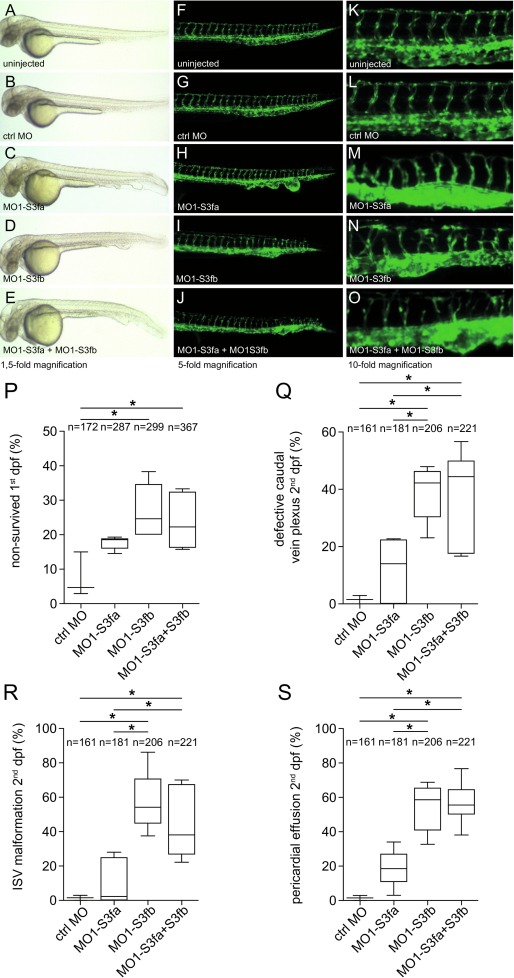 Fig. 6 Sema3F is essential for the proper angiogenesis in zebrafish. Zebrafish embryos in 1- to 2-cell stage were injected with Sema3F-specific morpholino (Sema3Fa-(MO1-S3fa), Sema3Fb-morpholino (MO1-S3fb), or both). Uninjected and control-morpholino-injected embryos served as controls. (A-O) Representative pictures of zebrafish embryos in the transmitted light and fluorescent light microscopy were taken on 2nd day post fertilization (dpf). (P) On the 1st dpf, Sema3F morphants showed a higher mortality rate than zebrafish injected with control morpholino. On the 2nd dpf the larvae were dechorionated and examined for phenotypes. Sema3F morphants showed typical vessel ectasia in the distal trunk (Q), intersegmental vessel (ISV) malformations (R), as well as increased occurrence of pericardial effusions (S). All these features were observed most frequently in Sema3Fb morphants. (Q-R) The data presented are from 4 independent experiments, the total number (n) of zebrafish is shown in the figures. All box plots extend from the 25th to the 75th percentile, with the median marked. Whiskers extend from the 10th to the 90th percentile. Results were analyzed by one-way ANOVA followed by Bonferroni's multiple comparison test: *p < 0.05.