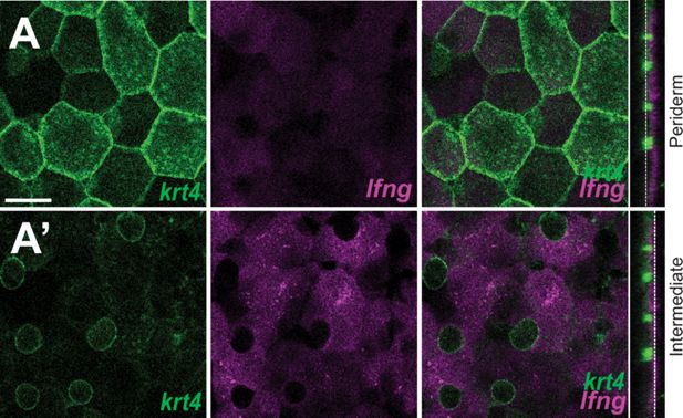 Fig. 4 - Supplemental 3 Notch signal modifiers in undifferentiated keratinocytes. (A–A’) Images showing lunatic fringe (lfng) expression in the intermediate layer of epidermis. Scale bars: 20 µm (A–A’).