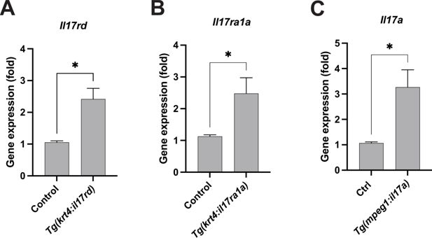 Fig. 5 - Supplemental 1 Overexpression of il17rd, il17ra1a, or il17a in transgenic animals. (A) Quantitative PCR reveals that il17rd mRNA is overexpressed in Tg(krt4:il17rd) (p=0.0159, N=3 independent experiments). (B) Quantitative PCR shows il17ra1a mRNA is overexpressed in Tg(krt4:il17ra1a) (p=0.0351, N=4 independent experiments). (C) Quantitative PCR demonstrates that il17a mRNA is overexpressed in the skin of Tg(mpeg1:il17a) animals (p=0.0183, N=4 independent experiments). Statistical significances were assessed by Student t test. Error bars indicate mean ± SEM.