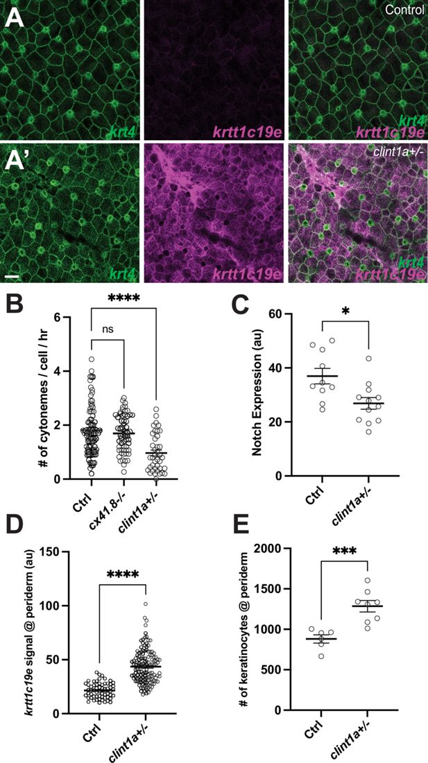 Fig. 6 - Supplemental 3 clint1 regulates epidermal maintenance via keratinocyte cytonemes. (A–A’) clint1 mutants exhibit a disorganized periderm. (B–E) clint1 mutants show (B) a lower frequency of cytoneme extension as compared to controls (WT, cx41.8-/-) (F2, 186 = 14.55, p<0.0001, N=10 larvae total), (C) reduced Notch responsiveness (p=0.0119, N=12 mutants, N=10 controls), (D) increased krtt1c19e expression in the periderm (p<0.0001, N=13 mutants, N=6 controls), and (E) a greater number of keratinocytes within the periderm (p<0.001, N=8 mutants, N=6 controls). Statistical significances were assessed by One-way ANOVA followed by Tukey’s HSD post hoc test and Student t test. Scale bars, 20 µm (A–A’). Error bars indicate mean ± SEM.