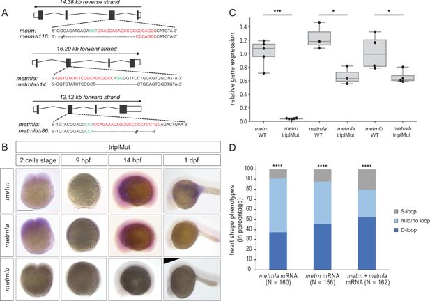 Fig. 1 - Supplemental 1 (A–C) Metrn genes CRISPR/Cas9 mediated knockout generation and validation. (D) Metrns loss-of-function effect on heart morphology. (A) Targeted metrns loci in the zebrafish genome for knockout generation. Red highlights the sgRNA homologous sequence, and PAM sequences are highlighted in green. The generated mutation is indicated below by dashed lines, and the number of deleted nucleotides is indicated after the D sign. (B) Metrn, metrnla, and metrnlb expression in triplMut embryos from two-cell stage to 1 day post fertilization (dpf) is highly reduced or undetectable by in situ hybridization (lateral views). (C) Metrns expression levels are reduced in triplMut embryos as shown by qRT-PCR analysis of metrn, metrnla, and metrnlb expression level at 14 hpf for metrn and metrnla and at 48 hpf for metrnlb in wild type (WT) and triplMut embryos. (Student t-test, ***p-value: 3.1e-06 for metrn; *p-value: 0.014 for metrnla; *p-value: 0.04 for metrnlb). Error bars indicate standard deviation. (D) Quantification in percentage of the number of embryos with S-looped, D-looped, or mild/no looped heart phenotypes at 2 dpf upon injection of metrnla mRNA, metrn mRNA, or both in triplMut embryos. Displayed p-values compared to WT: ****p-value:<1.0e-5 for metrnla mRNA, ****p-value:<1.0e-5 for metrn mRNA, ****p-value:<1.0e-5 for metrn +metrnla mRNA. Scale bar in (B) 250 μm. Source data for Figure 1—figure supplement 1 provided in “Figure 1—figure supplement 1—source data 1”.
