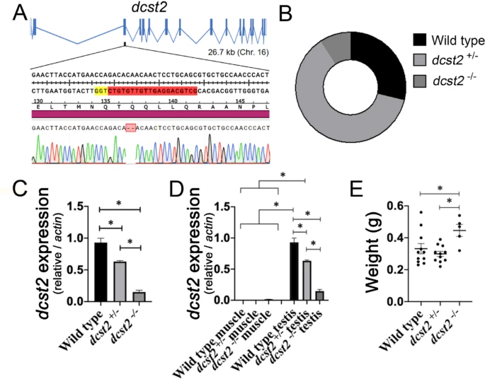 Fig. 3 Hematoxylin and eosin staining of male zebrafish trunk cryosections (A). Scale bar represents 500 μm. Insets of cross sections showing no obvious muscle fiber abnormalities (B), scale bar represents 50 µM. Tabulation of slow-twitch muscle fiber cross-sectional area between wild type and dcst2−/− muscle cells (C). Tabulation of fast-twitch muscle fibers cross-sectional area wild type and dcst2−/− zebrafish (D). No significant differences were found in any of our measures of muscle cells
