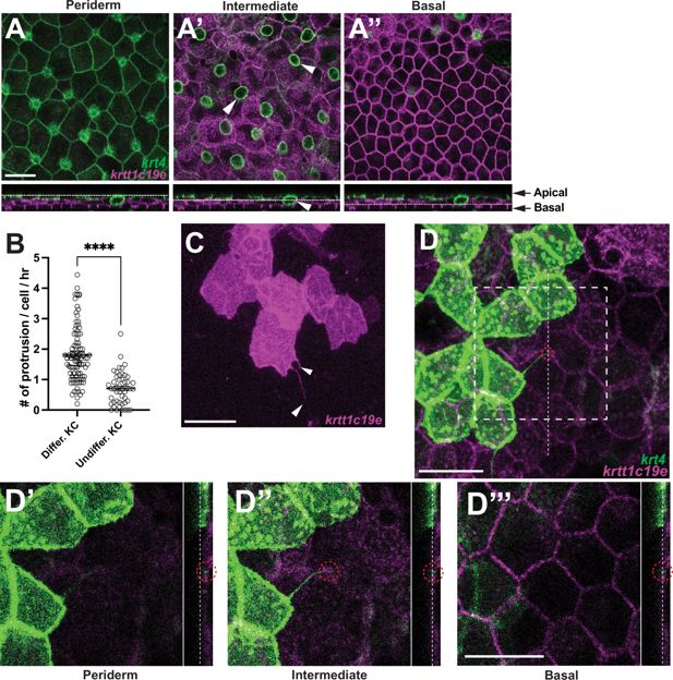Fig. 2 Keratinocyte cytonemes establish physical contact with underlying undifferentiated keratinocytes. (A–A”) Postembryonic zebrafish epidermis of Tg(krt4:lyn-EGFP;krtt1c19e:lyn-tdTomato) comprises three distinct layers. (A) Expression of lyn-EGFP in krt4+ cells in the periderm layer. (A’–A”) Expression of lyn-tdTomato (pseudo-colored magenta) in krtt1c19e+ cells in (A’) the intermediate layer and (A”) the basal layer. Note that the green circular labeling in (A’, arrowheads) represents mucous-secreting goblet cells. Chang and Hwang, 2011 (B, C) Undifferentiated keratinocytes (KC) extend significantly fewer cytoneme-like protrusions (arrowheads, p<0.0001, N=49, 3 larvae; N=91 cells, 6 larvae total). (D–D”’) Cytonemes from fully differentiated keratinocytes make physical contact with undifferentiated keratinocytes in the intermediate layer (red dotted circles). Note that dotted lines indicate the layers in the cross-sectional views. Statistical significances were assessed by Student t test. Scale bars: 20 µm (A–A”, C, D–D”’). Error bars indicate mean ± SEM.
