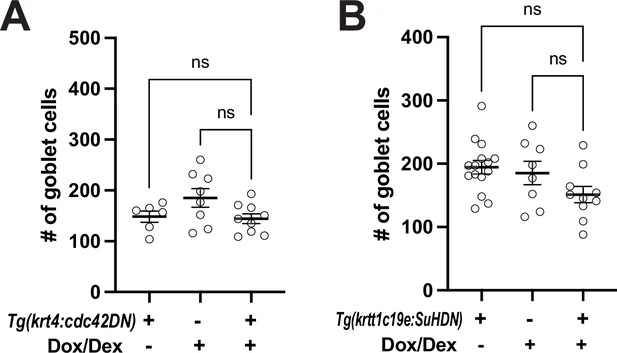 Fig. 3 - Supplemental 2 Goblet cell counts in the zebrafish epidermis. (A) Quantification of goblet cell numbers revealed no significant difference between two controls and experimental Tg(krt4:TetGBDTRE-v2a-cdc42DN) zebrafish (F2,20 = 2.763, p=0.0872, N=23 larvae total). (B) Quantification of goblet cell numbers showed no significant difference between two controls and experimental Tg(krtt1c19e:TetGBDTRE-v2a-SuHDN) zebrafish (F2, 30 = 3.040, p=0.0628, N=33 larvae total). Statistical significances were assessed by One-way ANOVA followed by Tukey’s HSD post hoc test.