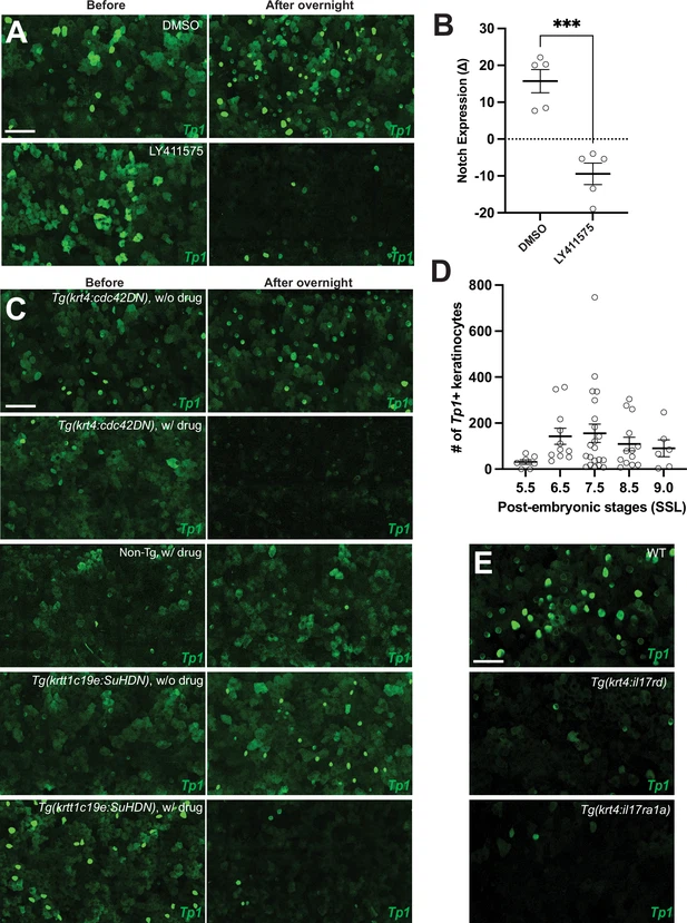 Fig. 4 - Supplemental 2 Notch reporter (Tp1) expression. (A) Images before and after treatment with DMSO and LY411575 (Notch inhibitor) in the Tg(Tp1:EGFP). (B) Treatment with LY411575 resulted in a significant overall reduction in Notch expression levels in the TP1 Notch reporter line compared to the DMSO control group (p<0.001, N=5 larvae per group). (C) Images before and after cytoneme inhibition through drug induction of cdc42DN-expression in krt4+ keratinocytes and direct inhibition of Notch signaling via drug induction of SuHDN expression in krtt1c19e+ keratinocytes, along with DMSO treatment. (D) The number of Tp1+ keratinocytes peaked during epidermal remodeling (6.5–7.5 SSL, N=58 larvae total) in zebrafish. (E) A significantly lower number of Tp1+ keratinocytes was observed in Tg(krt4:il17rd) or Tg(krt4:il17r1a1) compared to control (Figure 5C). Statistical significance was assessed by Student t test. Scale bars: 100 µm (A, C, E). Error bars indicate mean ± SEM.
