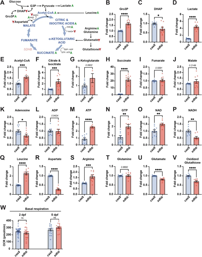 Fig. 3 sdhb CRISPants depict broad metabolic pertubations. A Schematic of Krebs cycle intermediates (in blue) and other metabolites from related pathways (in black) which have been assayed from whole 5 dpf larvae lysates. The changes observed in sdhb CRISPants are indicated with arrowheads (green: increase; red: reduction). B–V Individual metabolite quantified from whole sdhb-CRISPant larvae (pools of 10; n = 9 pools of 10) to Cas9-injected control larvae (n = 10 pools of 10). W Oxygen consumption rate (OCR) was measured in whole Cas9-injected control and sdhb-CRISPant larvae at 2 and 5 days post-fertilization (dpf) using a Seahorse XFe96 analyzer. Unpaired t-test with two-tailed p-value calculation: * p-value < 0.05; ** p-value < 0.01; *** p-value < 0.001; **** p-value < 0.0001.
