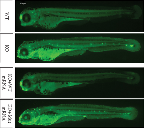 Fig. 2k Characterization of prps1a gene editing and phenotypic analysis in zebrafish. (a) Schematic of the zebrafish prps1a gene structure, highlighting the gRNA target sites. Arrows indicate gRNA binding sites, with exons represented as boxes. (b) Sequencing analysis of mutations induced by the two gRNAs showing various mutation types, including insertions, deletions, and substitutions. (c) Validation of gRNA activity through cleavage assays, assessing the efficiency of double-strand break induction by each gRNA. (d) Hair cell staining in zebrafish larvae across four experimental groups: wild-type (WT), gene KO, KO with wild-type mRNA injection (KO+WT mRNA), and WT with Cys165Tyr mutant mRNA injection (WT+Cys165Tyr). Scale bar = 200 μm. (e) Confocal microscopy images of hair cells in zebrafish larvae from different experimental groups showing structural integrity and localization. Scale bar = 20 μm. (f) Quantification of hair cells in different experimental groups. (g) Behavioral tracking of zebrafish larvae, recording movement patterns to assess the impact of prps1a gene editing on behavior. (h) Line graph of swimming distance of zebrafish with different genotypes under noise. (i) Statistical analysis of behavioral data of total distance. (j) Statistical analysis of behavioral data of first distance. (k) Representative microscopic images of hair cells stained with AO in zebrafish larvae from different experimental groups. Scale bar = 100 μm. (l) Quantification of fluorescence intensity in hair cells of the larvae. Data were compared using ANOVA followed by post hoc tests, with significant differences indicated (p < 0.05). Data are presented as mean ± SD. ∗p < 0.05, ∗∗p < 0.01, ∗∗∗p < 0.001, and ∗∗∗∗p < 0.0001.