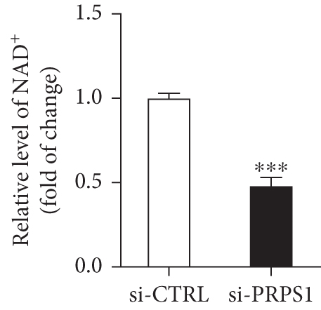 Fig. 3c PRPS1 knockdown reduces NAD+ levels, NAD+/NADH ratio, and cell viability in HEI-OC1 cells. (a) Western blot analysis of PRPS1 expression after transfection with PRPS1-siRNA or negative-siRNA, with tubulin as the internal control. (b) Quantification of PRPS1 expression levels from (a). Measurement of intracellular (c) NAD+ levels and (d) NAD+/NADH ratio in si-CTRL and si-PRPS1 groups. Measurement of intracellular (e) NAD+ levels and (f) NAD+/NADH ratio in si-PRPS1 and si-PRPS1+NMN groups. (g) Cell viability assessed by CCK-8 assay. Data are presented as three independent experiments’ mean ± SD. ∗∗∗p < 0.001 and ∗∗∗∗p < 0.0001 compared with the si-CTRL; ####p < 0.0001 compared with the si-PRPS1