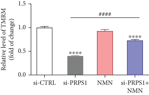 Fig. 4i PRPS1 knockdown regulates intracellular ROS levels and mitochondrial function via the NAD+/SIRT3/SOD2 pathway in HEI-OC1 cells. (a) Western blot analysis of PRPS1, SIRT3, and SOD2, with tubulin as the internal control. (b) Quantification of protein expression levels from (a). (c) SOD activity measured using a total superoxide dismutase assay kit with WST-8. (d) Representative microscopic images of HEI-OC1 cells stained with DCFH-DA in each group. Scale bar = 20 μm. (e, f) Flow cytometry analysis of DCFH-DA staining, showing quantitative changes in green fluorescence. (g) Representative microscopic images of HEI-OC1 cells stained with TMRM in each group. Scale bar = 20 μm. (h, i) Flow cytometry analysis of TMRM staining, showing quantitative changes in fluorescence. Data are presented as mean ± SD from three independent experiments. ∗p < 0.05, ∗∗∗p < 0.001, and ∗∗∗∗p < 0.0001 compared with si-CTRL; ####p < 0.0001 compared with si-PRPS1.
