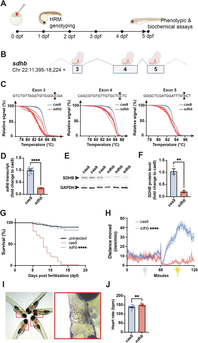 Fig. 1 F0-injected sdhb-CRISPant zebrafish larvae display SDHB-associated phenotypes. A Timeline representation of our CRISPant approach starting with the microinjection of a gene-specific (i.e., sdhb) CRISPR/Cas9 mix in single-cell embryos, followed by High-Resolution Melting (HRM) genotyping from 1-day post-fertilization (dpf). Phenotypic and biochemical readouts can be acquired only few days following injection. B The genetic landscape of the zebrafish sdhb gene encompassing targeted exons 3, 4 and 5. C The mutagenic power of the injected CRISPR/Cas9 mix is validated by HRM comparing Cas9-injected embryos as controls in which only mRNA encoding CAS9 was microinjected (no gene-specific guide RNAs). D, E, F The level of sdhb expression is reduced in sdhb CRISPants both at the transcriptomic and protein levels as assessed by qRT-PCR (D) and western blot (E, F). (G) Survival of sdhb CRISPants (n = 51) is compared to Cas9-injected controls (n = 29) and uninjected larvae (n = 87) over 18 days. H The distance swam, binned per 30 s, is recorded for sdhb CRISPants (n = 32) and Cas9-injected controls (n = 32) during 60 min dark and 60 min light periods. I, J Representative setup and results of heart rate quantification in 5 dpf larvae (sdhb CRISPants, n = 13; Cas9-injected, n = 12). I Left: larvae mounted laterally in 3% methylcellulose for simultaneous video acquisition (~5 larvae per trial). Red boxes indicate individual larvae analyzed. Right: magnified view of one larva with the heart region outlined (dashed line), corresponding to the area used for automatic beat detection by DanioScope™ software. No anesthetic was used during acquisition. J Heart rate was quantified and compared using an unpaired t-test with two-tailed p-value calculation: ** p-value < 0.01; **** p-value < 0.0001. Icons in (A) and (B) are created in BioRender. Samarut, E. (2025)