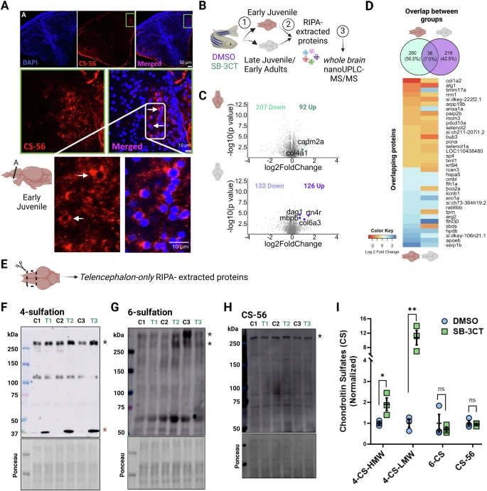 Fig. 6 MMP-2/9 inhibition increases plasticity restricting 4-O-sulfated CSPGs with no difference in plasticity permissive 6-O-sulfated CSPGs. A Representative image of chondroitin sulfate (CS)-rich PNNs surrounding the cell body of cells (white arrows) within the telencephalon of early juvenile zebrafish. B Representative workflow of the proteomics assay using whole brain lysates. C Volcano plots showing downregulated and upregulated proteins after MMP-2/9 inhibition with identified known MMP-9 substrates in both groups. D Shows the percentage of overlapping and non-overlapping proteins between groups. E Representative cartoon image of a zebrafish brain showing the part of the brain (telencephalon-only) used for Western blot analyses. F–H Representative pooled telencephalon-only Western blots for 4-O-sulfation, 6-O-sulfation, and CS-56, respectively. An average of 10–15 zebrafish telencephalon-only were pooled per group (n = 3). For 4- and 6-O-sulfation, samples were first digested with ChABC. I Quantification of Western blots. Quantified bands are highlighted using asterisks. Specifically, for 4-O-sulfation high molecular weight (HMW) band is denoted by the black asterisk while the low molecular weight (LMW) band is denoted by the red asterisk. For 6-O-sulfation quantification, both HMW bands were averaged for quantification. Graphs are expressed as mean ± S.E.M. Unpaired t-test. *p < 0.05, **p < 0.01. Created in BioRender. https://BioRender.com/3xjj2ln.