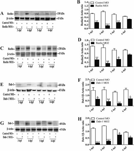 Fig. 3 Knock-down of Reelin morpholino and Dab-1 morpholino oligonucleotides (MOs). Reelin MO1 (A, B) and MO2 (C, D) reduced Reelin expression as determined by western blot analysis. Similarly, Dab-1 MO1 (E, F) and MO2 (G, H) reduced Dab-1 expression as determined by western blot analysis. Twenty-four larvae per group were pooled for western blot analysis in three independent experiments. β-Actin served as the loading control. Data represent means ± SEM, *p < 0.05, **p < 0.01, one-way ANOVA with Tukey's post hoc test.