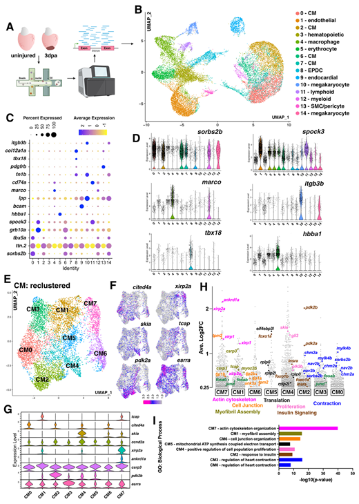 Fig. 1 snRNA-seq of the regenerating adult zebrafish heart identifies eight dynamic CM populations. (A) Overview of snRNA-seq of zebrafish heart regeneration experiment. Created in BioRender by Tsang, M. (2025). https://BioRender.com/t1a2g67. This figure was sublicensed under CC-BY 4.0 terms. (B) UMAP visualization of nuclei from snRNA-seq of uninjured and 3 dpa hearts. Clusters are color coded with cell annotation. (C) Dot plot showing differentially expressed marker genes per cluster 0-14. (D) Violin plots showing expression levels of key cell type markers. (E) UMAP visualization of second level reclustered CMs colored by cluster. (F) Feature plots visualizing distinct gene expression in CM clusters. (G) Violin plots showing expression levels of key markers across CM clusters. (H) Gene expression plot by average log2 fold change in each cluster. Each dot represents a single gene. Genes with functions related to actin cytoskeleton organization (fuchsia), cell junction rearrangement (orange), myofibril assembly (olive green), translation (black), proliferation (light pink), insulin signaling (brown) and contraction (blue) are shown. (I) Plot of top GO terms enriched for each cluster identified via the ToppFUN bioinformatic tool.