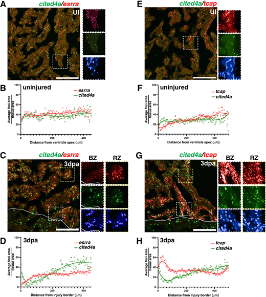 Fig. 2 cited4a, esrra and tcap expression in distinct CM populations in regeneration. (A-D) Representative image of cited4a (green) and esrra (red) transcripts detected by RNAscope and quantification of signal foci/tissue area in relation to distance from the border zone in an uninjured (UI) (A,B) and injured (3 dpa) (C,D) ventricle. (E-H) Representative image of cited4a (green) and tcap (red) transcripts detected by RNAscope and quantification of signal foci/tissue area in relation to distance from the border zone in an uninjured (E,F) and in 3 dpa (G,H) ventricle. Signal/tissue area is normalized 0 to 100. Trend line shows the average from n=4 hearts per condition. Magnification of dashed boxed areas to right show individual channels in regions close to the border zone (BZ, white box) or remote zone (RZ, yellow box). Scale bars: 100 µm.